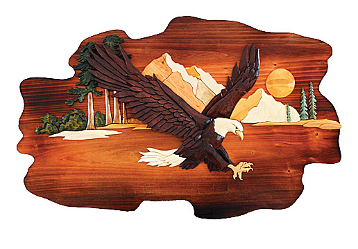 The Burly Bears Eagle Intarsia is 23" by 15". It is hand crafted to ensure quality and uniqueness. Because it is hand crafted, each is different. No two are exactly the same. This beautiful piece of art will make a lovely addition to your home, cabin, or lake house. No shipping to Alaska, Hawaii, or Canada.